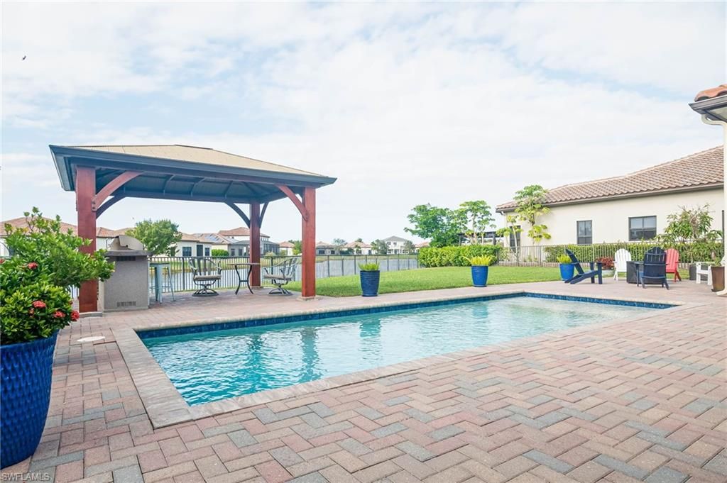 Discover the perfect balance of vibrant living and serene comfort at 5542 Ferrari Ave in the dynamic community of Ave Maria, FL. Nestled in a peaceful CUL-DE-SAC, this elegant CHESBRO model home spans 3,086 sqft on a ENORMOUS 0.3-ACRE LOT, featuring 3 bedrooms, a den, and 2.5 bathrooms in a thoughtfully designed SINGLE-STORY layout. The FULLY FENCED yard, LANDSCAPED FOR PRIVACY with stunning LAKE VIEWS, forms a tranquil retreat, while the location in a bustling neighborhood ensures a lively living experience. Enhanced with IMPACT WINDOWS throughout, the home offers both safety and energy efficiency. The master suite is a sanctuary, featuring a COZY SITTING AREA, TWO EXPANSIVE MASTER CLOSETS, a DUAL MASTER BATHROOM, each with its own sink and toilet. The bright interior, illuminated by natural light entering through the NUMEROUS AND LARGE WINDOWS, showcases high 12-FOOT CEILINGS, framed by CROWN MOLDING, and 8" BASEBOARDS. The layout includes separate living and family rooms, both spacious and perfect for hosting guests or enjoying family activities. Step outside to the screened lanai, leading to a SPECTACULAR OUTDOOR AREA with a HEATED SALTWATER POOL and a stylish CABANA equipped with an OUTDOOR KITCHEN